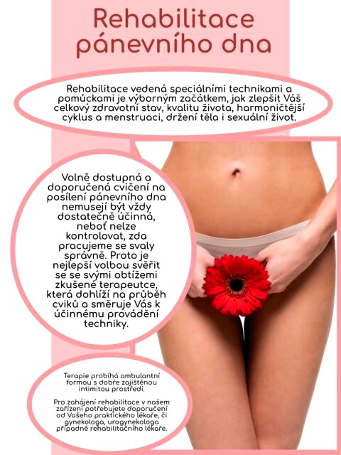 Rehabilitace vedená speciálními technikami a pomůckami je výborným začátkem, jak zlepšit Váš celkový zdravotní stav, kvalitu života, harmoničtější cyklus a menstruaci, držení těla i sexuální život.